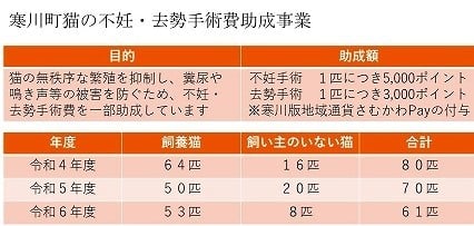 飼い主のいない猫および飼養猫の不妊・去勢手術費の一部を補助する寒川町猫の不妊・去勢手術費助成事業を実施しているほか、町内ボランティア団体と協働でTNR活動の取り組みを進めています。