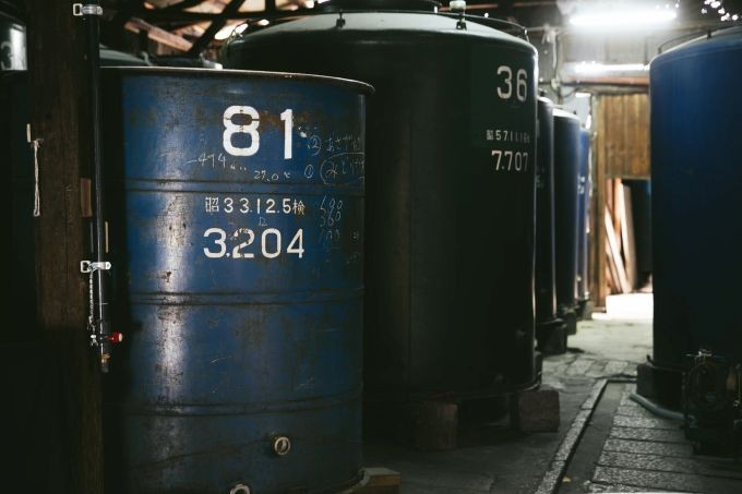 東蔵は、大正 13 年棟上げ、築 100 年の酒蔵で、300 坪の土地に 85 個の貯酒タンクが並びます。