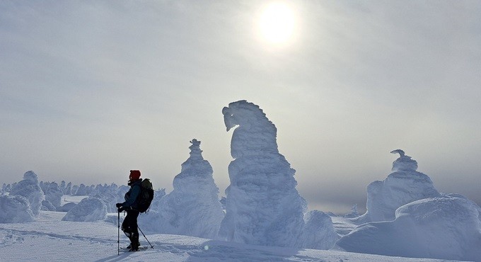 蔵王の樹氷は、季節風に含まれる氷点下の水滴が、オオシラビソの木々に凍り付いてでき、大きいもので5mを超えます。