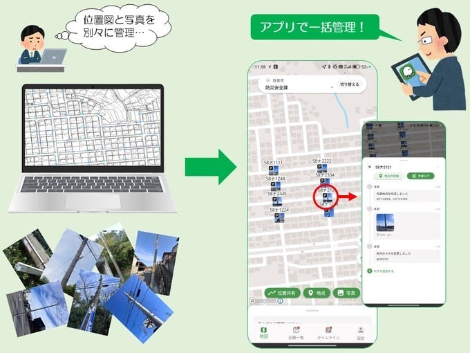 8,000基の位置情報を「LivMap」に掲載し、移設や誤差を記録できる状態にします。