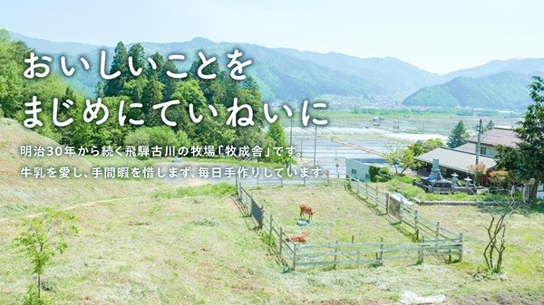 牧成舎は、明治30年創業という長い歴史を誇り、飛騨の豊かな自然のもとで、乳牛の飼育から乳製品製造に至るまでを一貫して手がけています。
