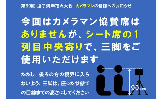 今年も砂浜での三脚使用は原則ご遠慮いただくこととし、カメラマン協賛席は設けず、波打ち際の一般協賛シート席の最前列のうち花火が正面に見えるエリアのみ、三脚の使用をOKとすることに決まりました。