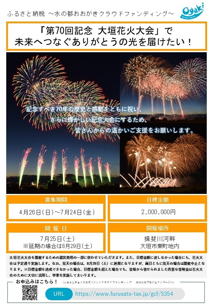 水の都おおがきクラウドファンディングとして、「大垣花火大会」の開催にご賛同いただける市内外の皆さんからの寄附を募集しています。