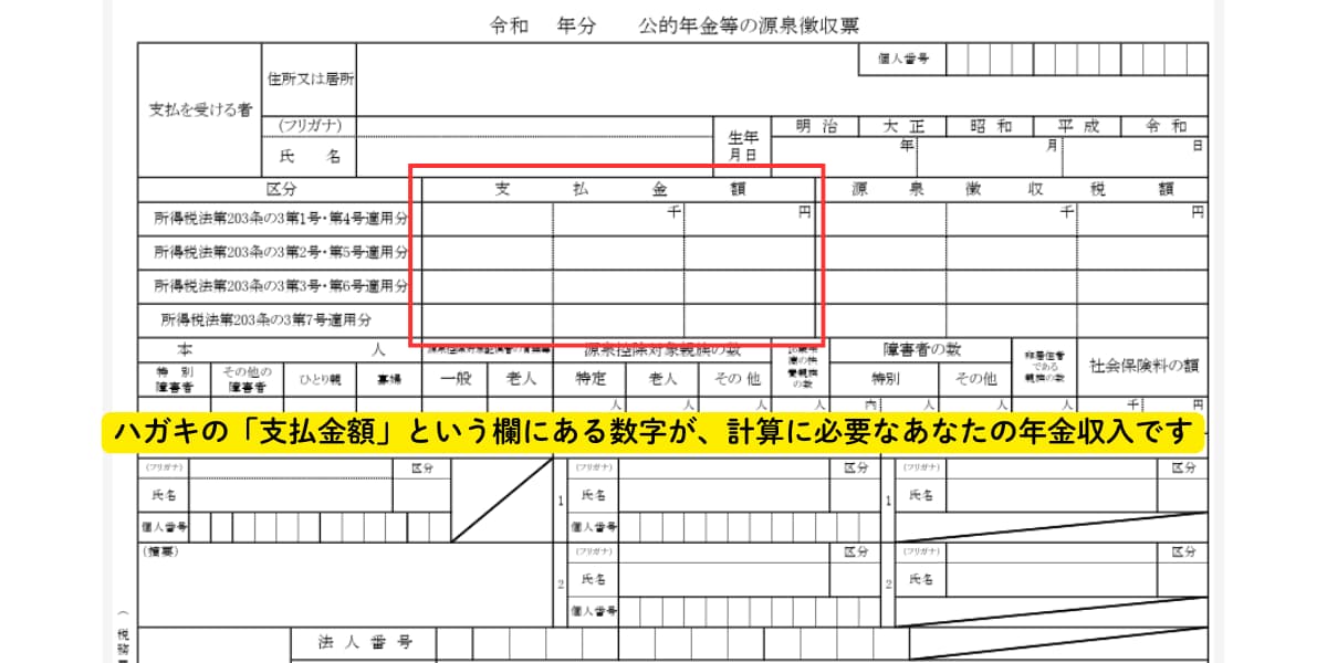 主な収入が公的年金のみの方は、毎年1月頃に日本年金機構などからハガキで届く「公的年金等の源泉徴収票」を確認しましょう。※以下はイメージサンプルです、はがきの様式によって体裁は変わります。
