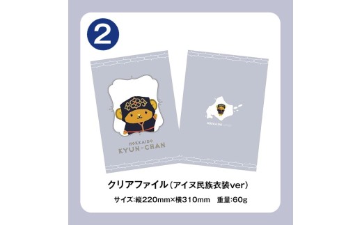 容量 | ◆キュンちゃんマスコットキーチェーン(アイヌ民族衣装ver)(サイズ:縦115mm×横95mm×幅60mm(最大)重量:29g) ◆クリアファイル2種類(アイヌ民族衣装ver、北海道庁ver)(サイズ:縦220mm×横310mm 重量:60g) ◆スケッチブック(サイズ:縦122mm×横175mm 重量89g) |