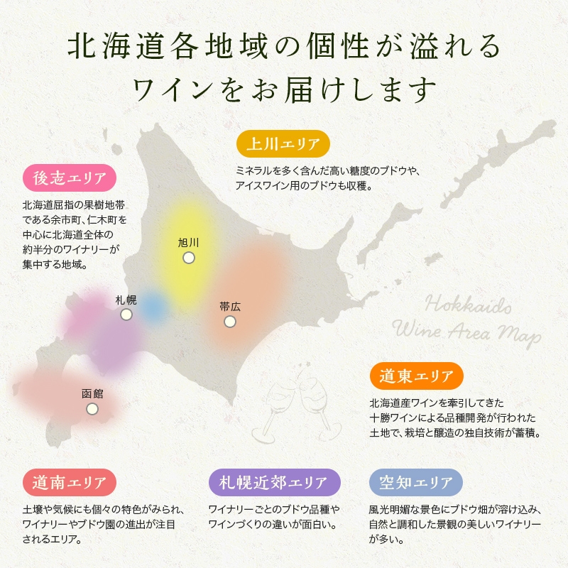 冷涼な北海道の気候と、卓越した技術により生まれたフレッシュでエレガントな味わいと、作り手それぞれの“想い”を是非ご賞味ください。