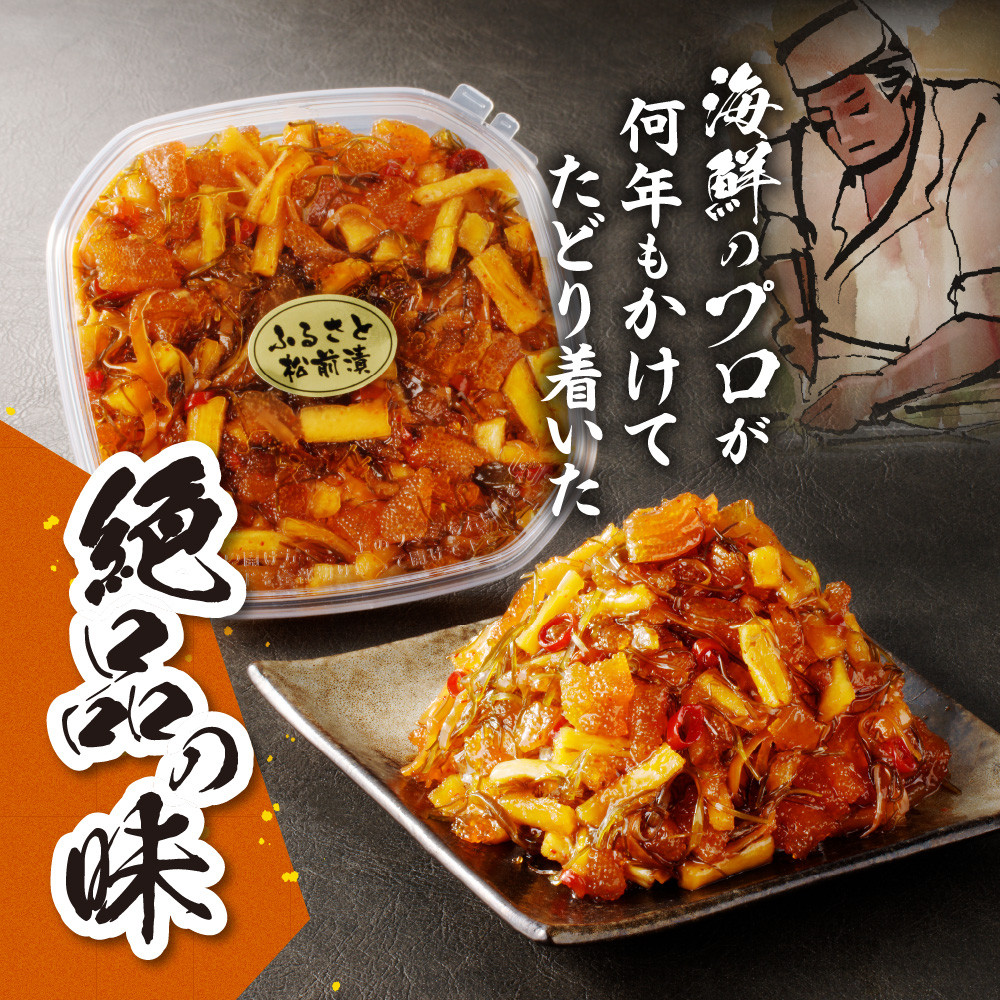 海鮮のプロが何年も掛けてたどりついた絶品の味! スルメと昆布を細切りにし数の子をたっぷり入れ、歯切れの良い切り干し大根が入っています。 スルメと昆布の旨味がしっかりしみ切り干し大根の歯ごたえ、そしてコリコリとした数の子と大根の歯ごたえがたまりません。また唐辛子のピリ辛さがさらに食欲をそそります。 ご飯のお供やお酒の肴にも抜群です! ■関連キーワード:北海道名産 数の子 松前漬け 200g×2 (合計400g) 小分け 厳選 ご飯のお供 お酒の肴 お取り寄せ おつまみ おかず ピリ辛 干し大根 スルメ 昆布 10000円 北海道 札幌市