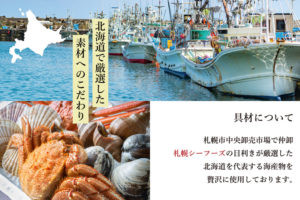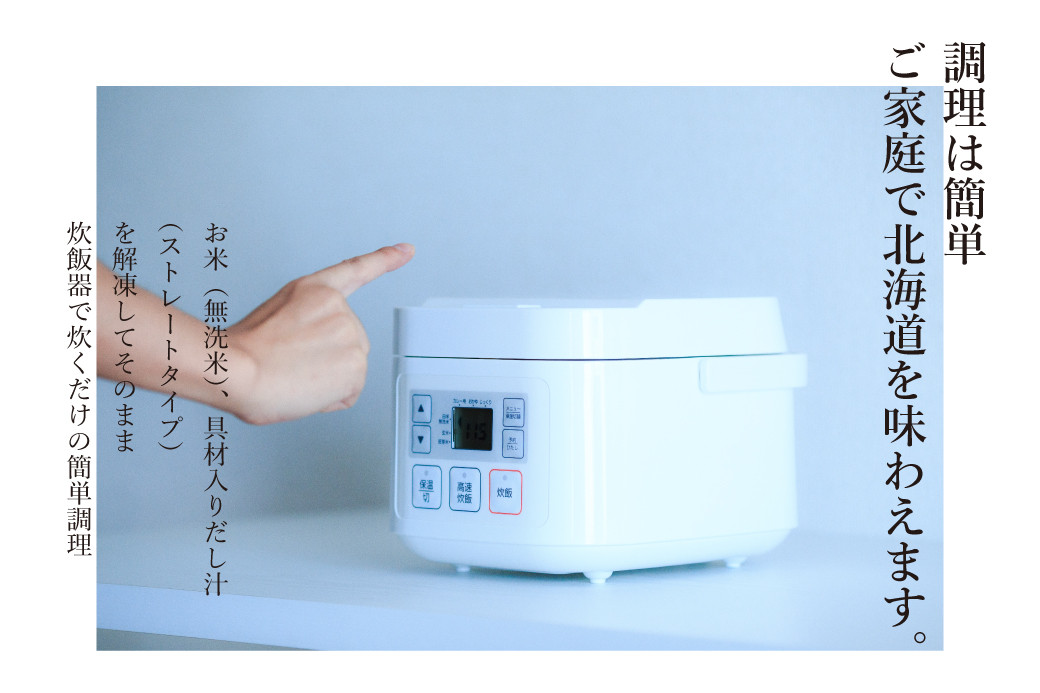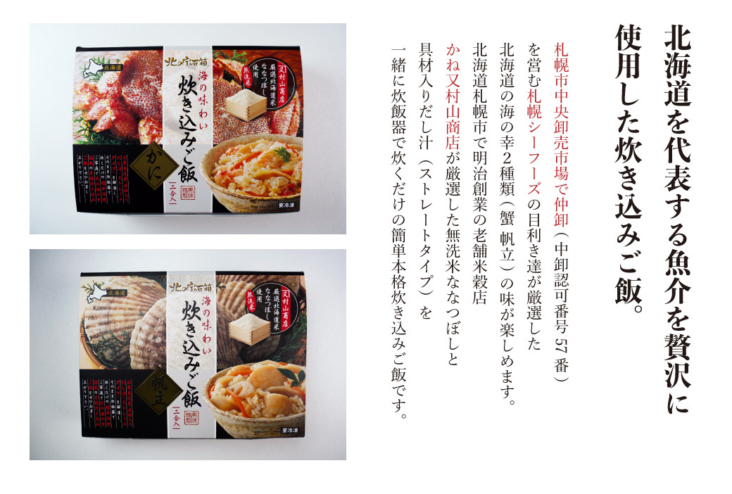 札幌市中央卸売市場で仲卸を営む札幌シーフーズの目利きが厳選した北海道の海の幸2種類(帆立,蟹)を贅沢に使った炊き込みごはんとお米も北海道で明治創業の老舗米穀店かね又村山商店が厳選したななつぼし。ご自宅で北海道を味わえる炊き込みご飯です。具材入りだし汁を解凍し無洗米ななつぼしをそのまま炊飯器で炊くだけの簡単調理です。