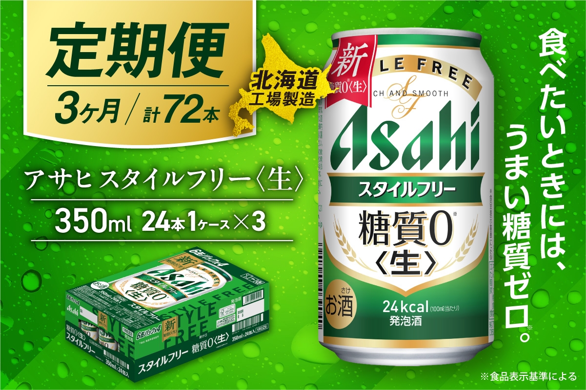 【定期便 3ヶ月】アサヒ スタイルフリー<生><350ml>24缶 1ケース 北海道工場製造 缶ビール ビール 発泡酒 糖質ゼロ ビール工場製造 ビール定期便 北海道 札幌市