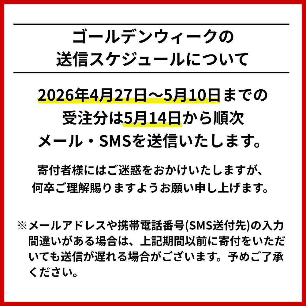 2026年4月27日から2026年5月10日までの受注分につきましては 2026年5月14日よりEメールにてお申込URL、SMSにてパスワードを順次送信いたします。 |
