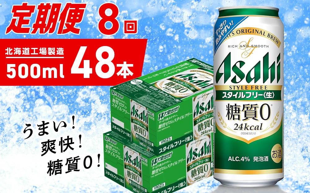 【定期便 8ヶ月】アサヒ スタイルフリー<生><500ml>24缶 2ケース 北海道工場製造 缶ビール ビール 発泡酒 糖質ゼロ ビール工場製造 ビール定期便 北海道 札幌市