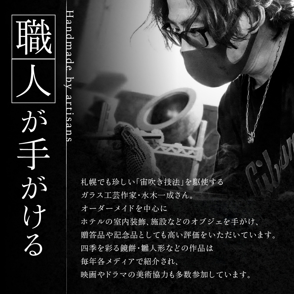 札幌出身のガラス工芸作家水木一成が生み出す硝子の兜飾りは、ガラスの中に気泡を閉じ込め和洋あらゆるシーンに合う洗練されたデザインが特徴。