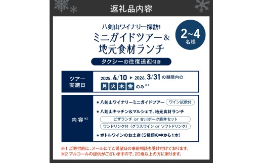 容量 | ■内容 ・タクシーによる往復送迎 ・八剣山ワイナリーミニガイドツアー(ワインの試飲付き) ・八剣山キッチン&マルシェでの地元食材ランチ(ピザランチまたは古川ポーク豚丼セット)ワンドリンク付(グラスワインまたはソフトドリンク) ・ボトルワインのお土産(ナイアガラBRUT、キャンベルセニエ、シードル、かのん、ナイアガラドライのいずれか) ■配送方法 ご寄付申し込み後、メールを送信いたします。 ■送信用メールアドレス 下記いずれかのメールアドレスから送信いたします。 support@sapporo.furusato-lg.jp contact@hokkaido-island.com ※@sapporo.furusato-lg.jp、@hokkaido-island.comからのメールを受信可能な状態に設定してください。 ■ご予約の流れ ・寄付申し込み後、メールにてご希望日、お迎え場所等をお伺いさせていただきますので、ご返信いただきますようお願い申し上げます。 ・ご予約は、ご利用日の10日前までにお願いいたします。 |