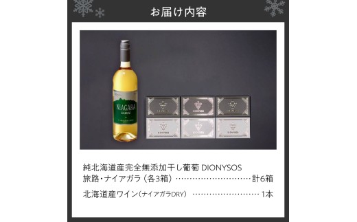 容量 | ■内容 【干し葡萄】旅路×3箱・ナイアガラ×3箱 合計6箱 各15g 【札幌産ワイン】ナイアガラDRY 1本 ■原材料 ぶどう |