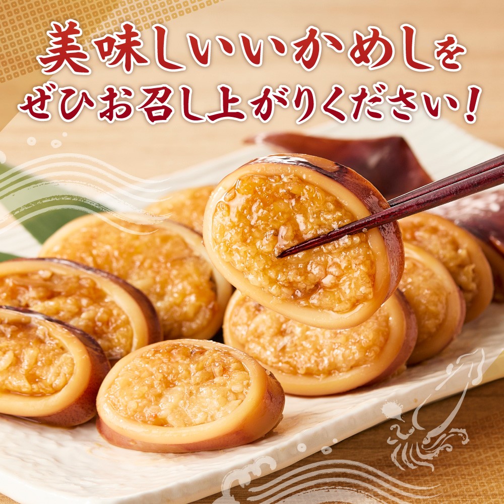大きないかに北海道産のもち米とゆめぴりかを詰めて、独自のたれで煮た後、液体の急速冷凍機(凍眠)の圧倒的な凍結スピードにより氷結晶の膨張を最大限に抑えました。
