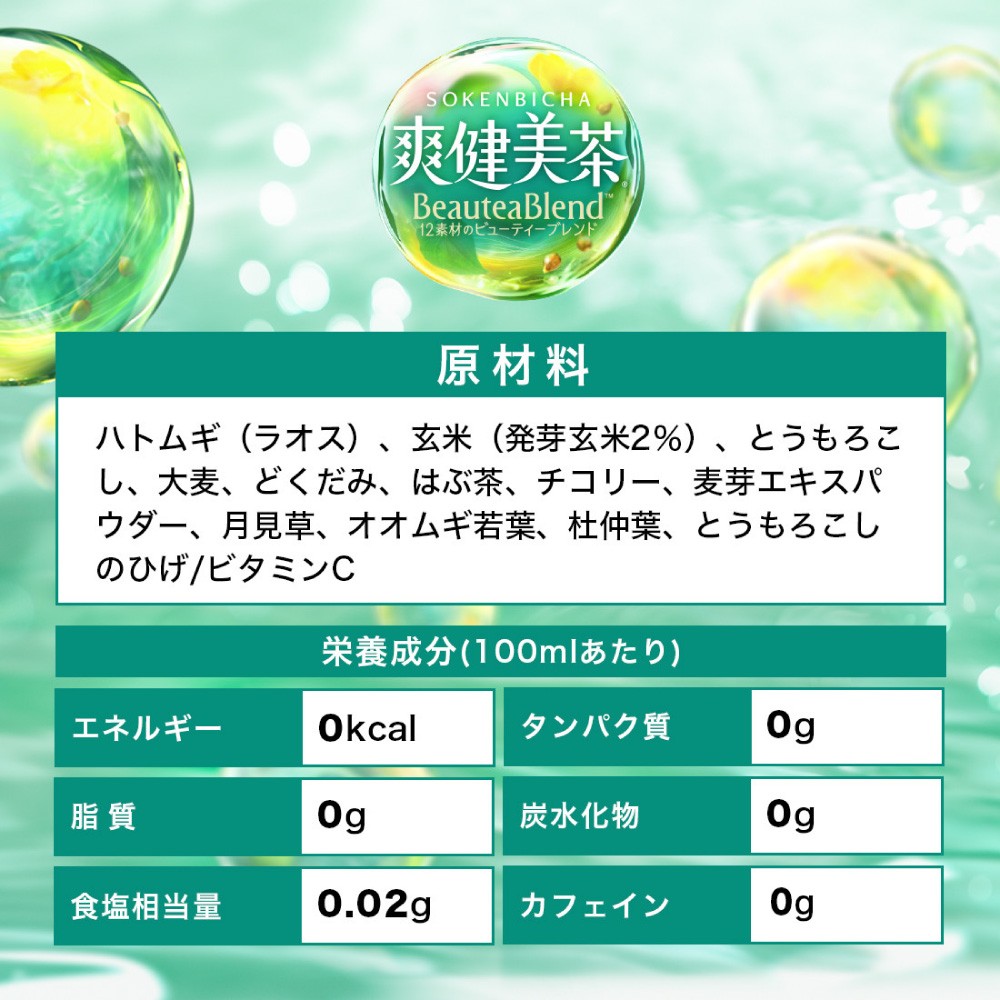 | 容量 | ■内容 爽健美茶<BeauteaBlend>600mlPET×48本 ■原材料 ハトムギ、玄米(発芽玄米2%)、とうもろこし、大麦、どくだみ、はぶ茶、チコリー、麦芽エキスパウダー、月見草、オオムギ若葉、杜仲葉、とうもろこしのひげ/ ビタミンC |