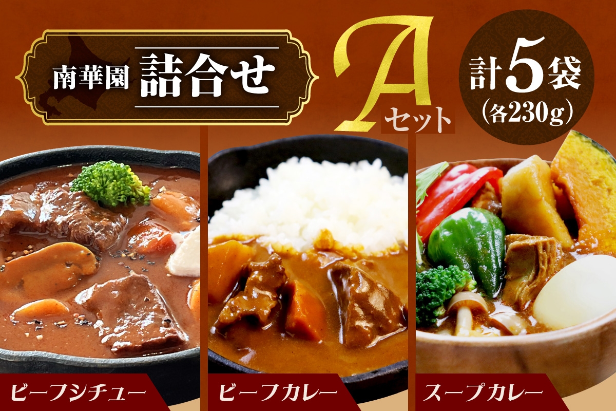 ~三つの味わいが、贅沢なひとときを演出~ 南華園 詰合せ5個入り【Aセット】|ビーフシチュー ビーフカレー スープカレー レンチン 北海道産 牛肉 鶏肉 簡単調理 北海道 札幌市