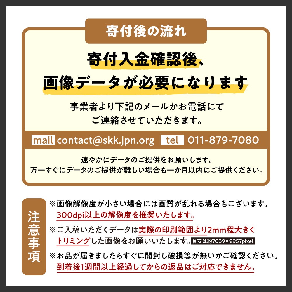※寄付入金確認後、画像データが必要になりますので事業者よりメール(contact@skk.jpn.org)かお電話(011-879-7080)でご連絡させていただきます。