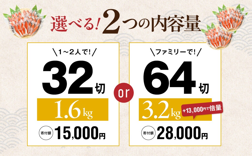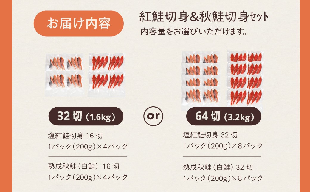 | 容量 | 【選べる内容量】 下記からお選びいただけます。 ・32切:塩紅鮭切身4切(200g)×4パック、熟成秋鮭(白鮭)切身4切(200g)×4パック ・64切:塩紅鮭切身4切(200g)×8パック、熟成秋鮭(白鮭)切身4切(200g)×8パック |