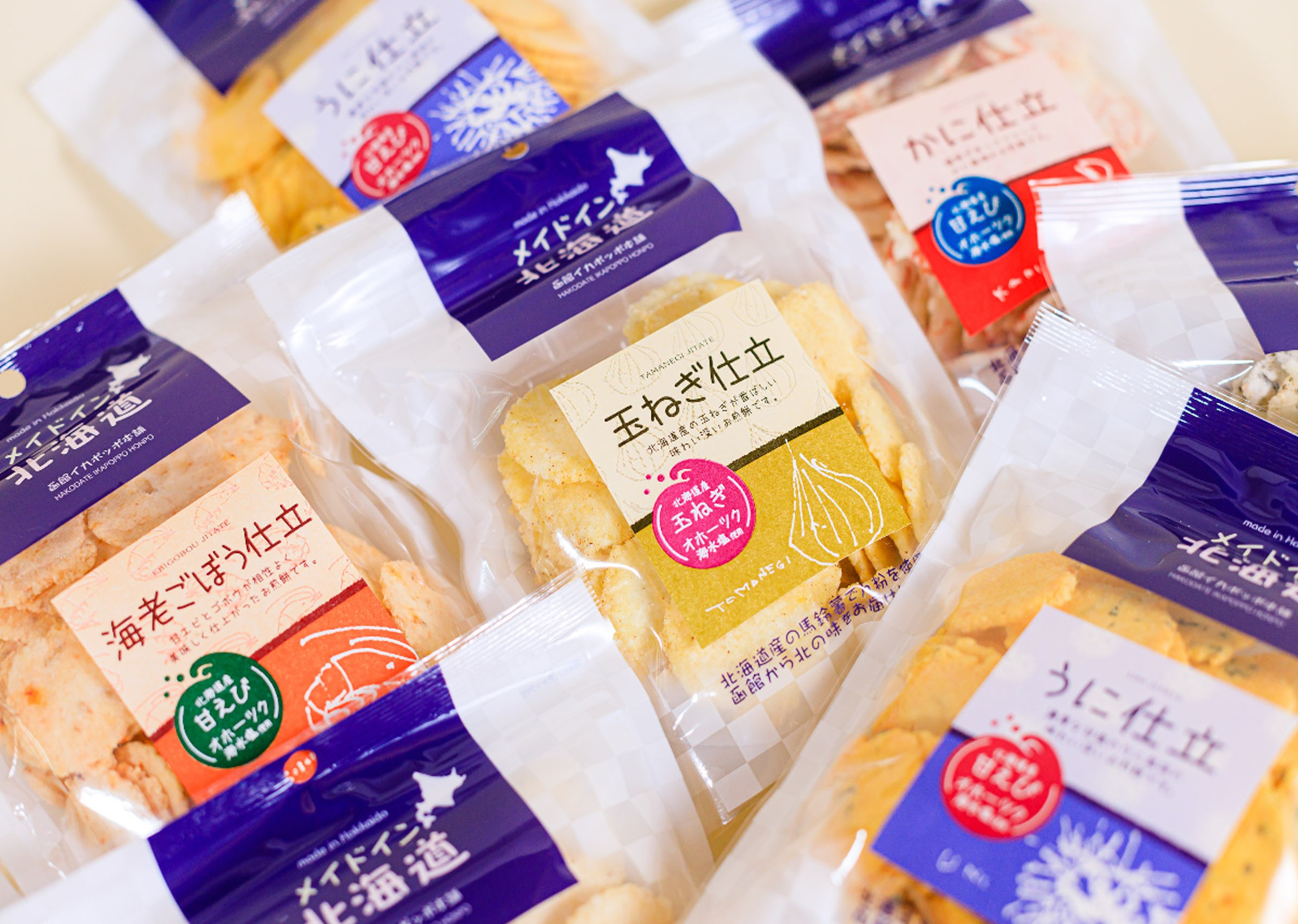 メイドイン北海道シリーズの煎餅は、北海道産の馬鈴薯でん粉をベースに、北海道産の甘えびとオホーツクの海水塩を練り込んで焼き揚げた北海道ならではの味わいです。味の種類は、うに味、かに味、昆布味、玉ねぎ、海老ごぼう、キタアカリと全部で6種類の詰め合わせです。北海道仕立のサクサク煎餅をお楽しみください。海老ごぼう仕立は本年2022年度の函館圏優良土産品推奨会で「国際コンベンション協会会長賞」を受賞しております。