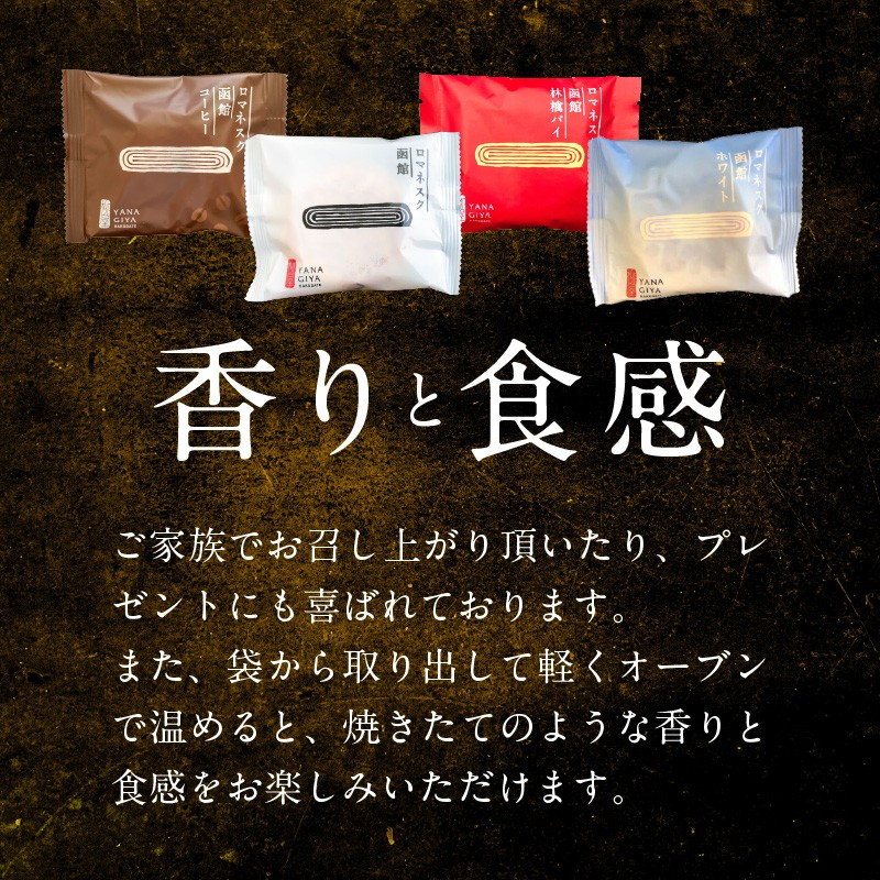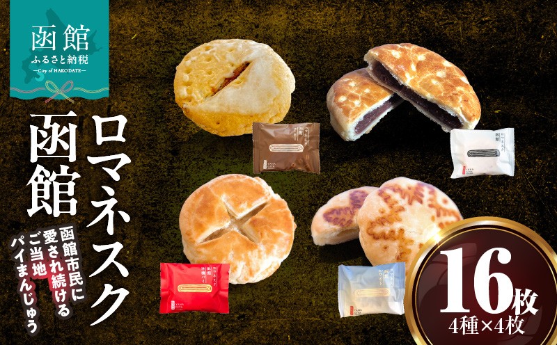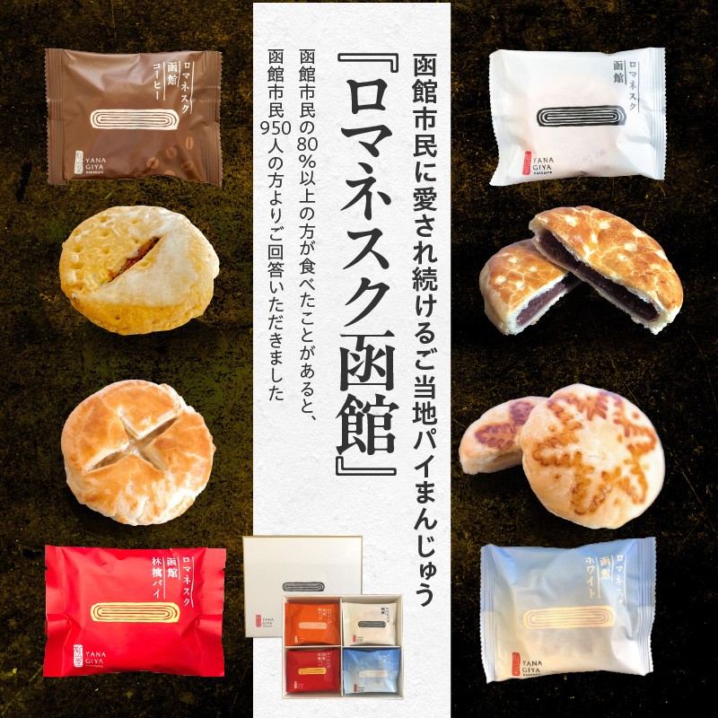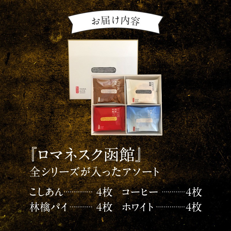 | 容量 | 函館のご当地パイまんじゅう『ロマネスク函館』全シリーズが入ったアソート品です。 こしあん×4枚 コーヒー×4枚 林檎パイ×4枚 ホワイト×4枚 |