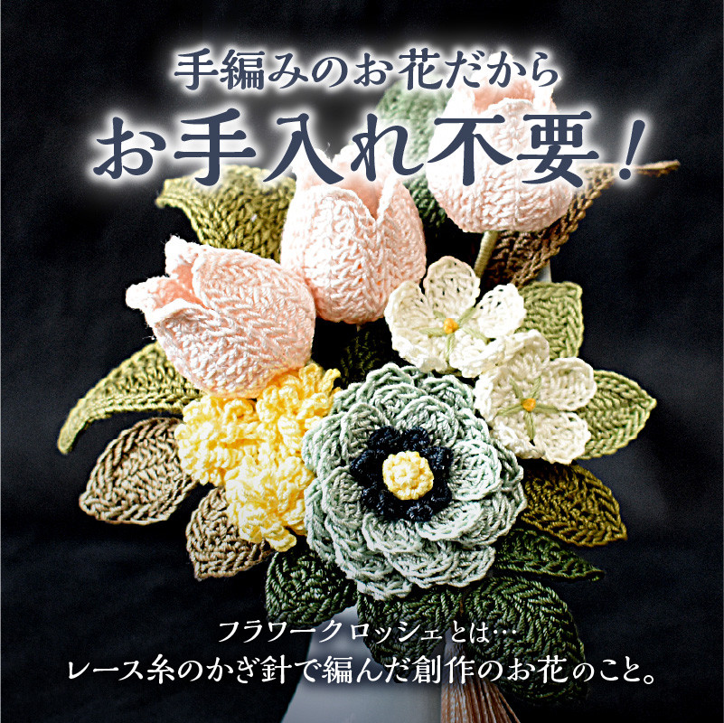 かぎ針2号で編んだ一生枯れないフラワークロッシェの供花です。 供花シリーズ フラワークロッシェ 小サイズ_HD067-012