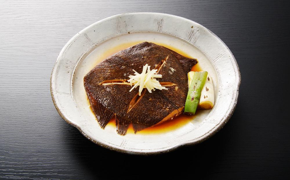 北海道の小樽港に水揚げされた新鮮な「浅羽かれい」を日本食の定番メニューの煮つけにしました。