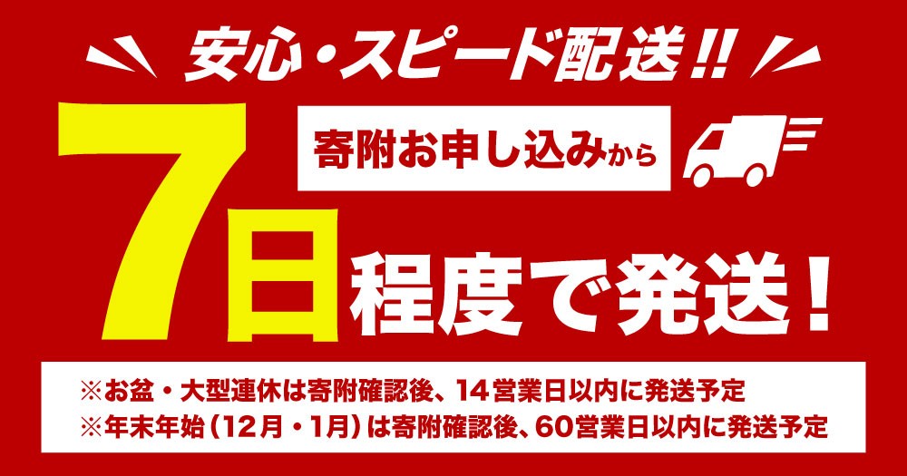 決済から7日程度で発送 お盆・GWは寄附確認後、14営業日以内に発送予定 年末年始(12月・1月)は寄附確認後、60営業日以内に発送予定 ※天候や発送状況により多少前後する場合がございますので、予めご了承ください。 |