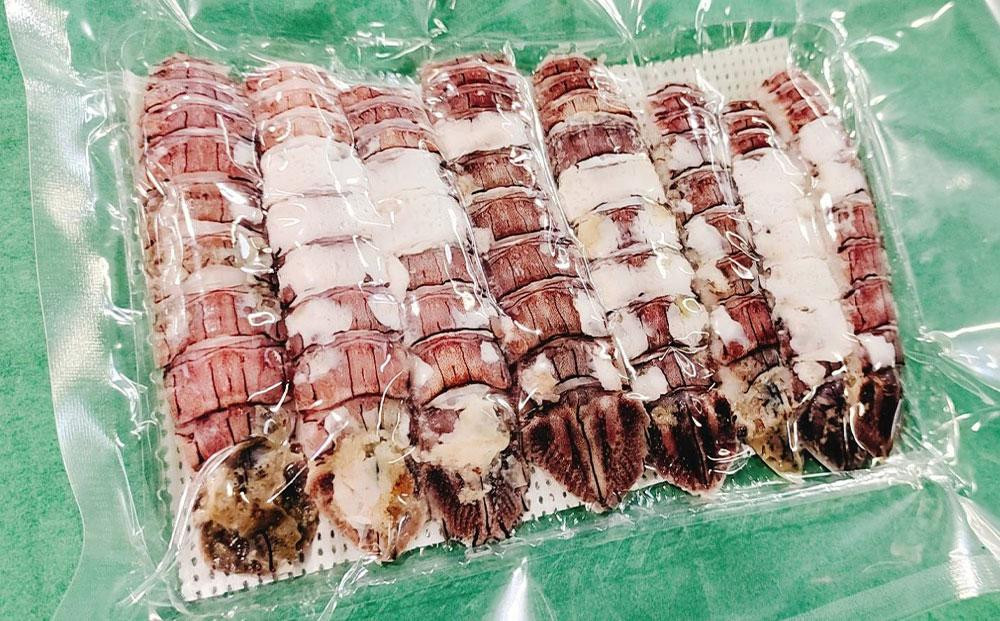 水揚げ後、鮮度の良い状態ですぐ浜茹でし、真空冷凍された秋シャコ