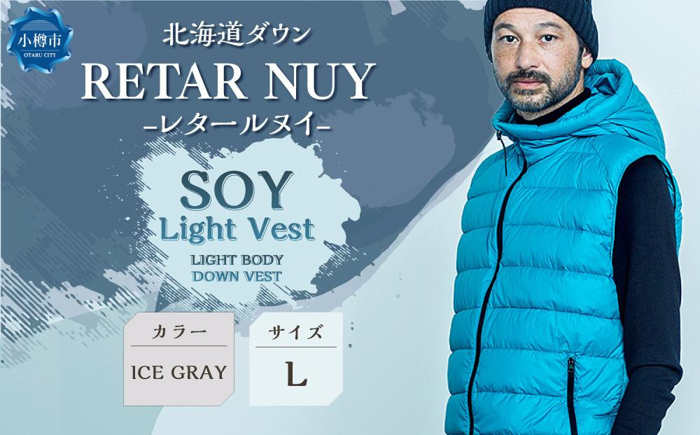 ポケッタブル収納でコンパクトに。SOYシリーズの軽量モデルです。 <UNISEX>北海道ダウン:RETAR NUY/レタールヌイ <SOY Light Vest/ソイ ライト ベスト>LIGHT BODY DOWN VEST [ICE GRAY/Lサイズ]