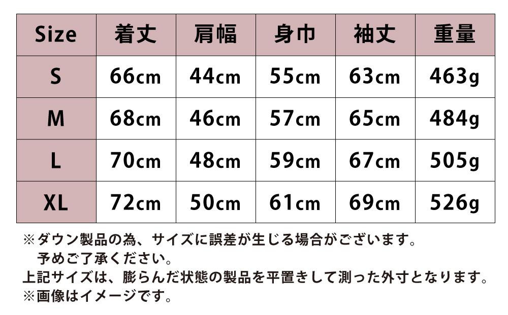 | 容量 | 【カラー】 WHITE BEIGE BLACK 【サイズ】 ・Sサイズ:着丈66cm、肩幅44cm、身幅55cm、袖丈63cm ・Mサイズ:着丈68cm、肩幅46cm、身幅57cm、袖丈65cm ・Lサイズ:着丈70cm、肩幅48cm、身幅59cm、袖丈67cm ・XLサイズ:着丈72cm、肩幅50cm、身幅61cm、袖丈69cm ◆1着あたりの重量 Ssize=463g Msize=484g Lsize=505g XLsize=526g ※内、98gは羽毛量となります。(Msizeを基準としております) ※1着あたりのおおよその重量なので、多少の前後はございます。 |