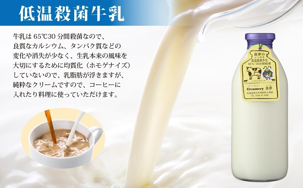 クリーマリー農夢 「アニマルウェルフェア認証商品」低温殺菌牛乳を2027年1月から12ヶ月毎月お届けします!!! 63℃30分間殺菌なので、良質なカルシウム、タンパク質などの変化や消失が少なく、生乳本来の風味を大切にするために均質化(ホモゲナイズ)していないので、乳脂肪が浮きますが、純粋なクリームですので、コーヒーに入れたり料理に使っていただけます。 ~アニマルウェルフェアとは~ 畜産動物がストレスから自由で、健康的な生活ができる状態を指す「アニマルウェルフェア」。そうした畜産のあり方を普及していくために、私たちができることに取り組みましょう。 ■受付期間 ~2026年12月31日まで ■発送時期 2027年1月より12か月(毎月第3水曜日に発送) 道内は木曜日、道外は金曜日着となります。 消費期限が短いのでお気を付けください! ※商品着日の変更は月内であれば承りますが、その際は1週間前までにメールでお知らせください。 メールアドレス:gnome@kcd.biglobe.ne.jp 【お礼の品に関するお問い合わせ先】 事業者名:クリーマリー 農 夢 連絡先:0166-62-9380 営業時間:09:00ー16:30 定休日:なし(通年営業)
