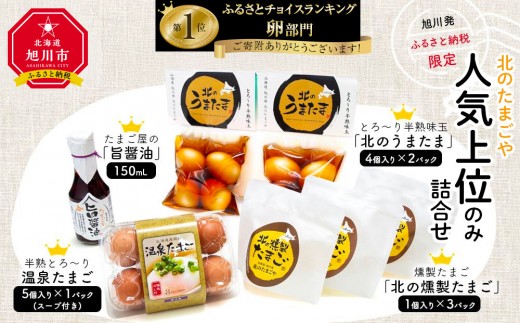 旭川市で1949年に創業。卵一筋の弊社が自信を持ってオススメいたします。 「北のうまたま」は完成に4年9ヶ月かかった弊社人気ナンバー1の半熟とろ~りな味玉です。 原卵は8箇所の養鶏場の卵で試行錯誤を繰り返してきました。 味が自慢です。 「温泉たまご」は完全栄養食品と言われる卵の中でも最も消化吸収に優れていると言われています。 更に弊社の温玉は抗酸化作用のあるアスタキサンチンを含有してます。 卵黄のとろみがたまりませんよ。 「北の燻製たまご」は塩と稚内直送の利尻昆布で作る専用タレに漬け込み、ナラのおがくずでじっくりと燻します。 全て手作りにこだわり、完成に約2週間もかかる伝統の商品です。 「たまごかけごはん醤油」は羅臼産の上質昆布と天然秋鮭節を贅沢に使用しております。 しかも塩分は控え目の9%。私、担当の鏡圭介は卵かけご飯が大好きで、いろんな醤油で食べましたが、この醤油が1番だと思っています。 このセットは当店人気の商品ばかりを詰合せにした、ふるさと納税限定品となっております! ◆お礼の品に関するお問い合わせ先◆ 事業者名:有限会社 旭川鶏卵 連絡先:0166-23-6435 【地場産品に該当する理由】 ・北のうまたま 区域外で生産された鶏卵を区域内で選別、加熱、冷却、殻剥き、選別、専用つゆ配合、充填、検品、ラベル等貼付、梱包作業を行っているため ・温玉 区域外で生産された鶏卵を区域内で選別、専用トレーに入れ替え、加熱、粗熱除去、低温保管、選別、パック詰め、梱包作業を行っているため ・たまごかけごはん醤油 区域内において原材料の仕入れ、醸造、梱包を行っているため (告示第5条第3号に該当) 当該地方団体の区域内において返礼品等の原材料の主要な部分が生産されているため。 〈当該返礼品等の主な原材料のうち、区域内で生産された原材料名〉 ・燻製たまご:卵 (告示第5条第2号に該当)