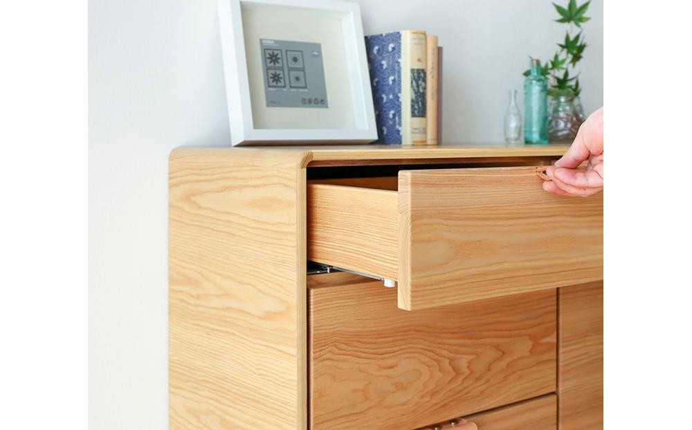 洗練されたデザインと素材の温かさが融合した、美しい木目が魅力的なチェスト。 素材に使用されているのは、丈夫で弾力性に富む「タモ」の中でも希少な存在の北海道産「エゾ・アッシュ」。本体のエッジ・扉・引き出しの内部にいたるまで、無垢材を惜しげもなく使用しました。引き出しには、勢いよく閉まらない「ソフトクローズ」、そして手前に引き過ぎても落下せずスムーズな開閉を可能にする「スライドレール」を採用。男女や年齢、和洋のインテリアも問わない、好感の持てる一台です。