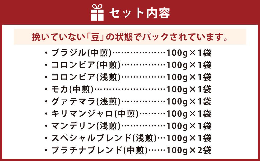 | 容量 | ブラジル(中煎)100g×1袋 コロンビア(中煎)100g×1袋 コロンビア(浅煎)100g×1袋 モカ(中煎)100g×1袋 グァテマラ(浅煎)100g×1袋 キリマンジャロ(中煎)100g×1袋 マンデリン(浅煎)100g×1袋 スペシャルブレンド(浅煎)100g×1袋 プラチナブレンド(中煎)100g×2袋 |