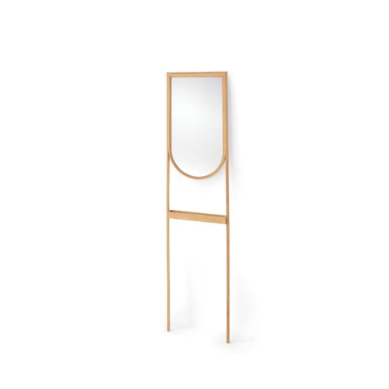 nendoの佐藤オオキ氏による、木が裂けているようなデザインが特長のスタンドミラー。眼鏡などの小物を入れられる便利なトレイ付きです。持ち運びや立て掛けが容易なため、様々な場所でお使いいただけます。