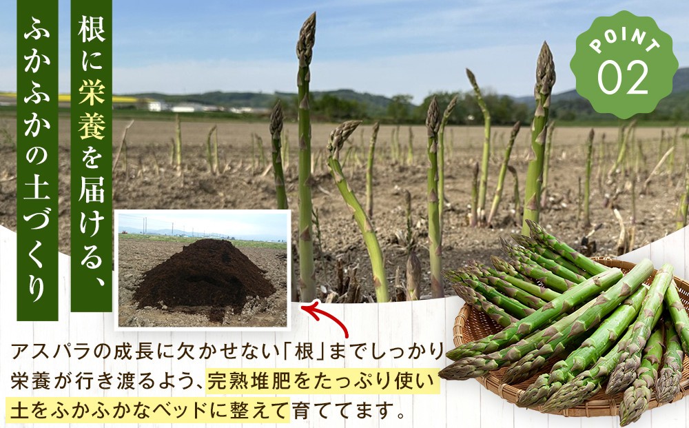 たっぷりの完熟たい肥(肥料)を土にすきこみ、微生物で土壌改良した栄養を吸収しやすい土壌で作った甘く柔らかい露地栽培のアスパラです。