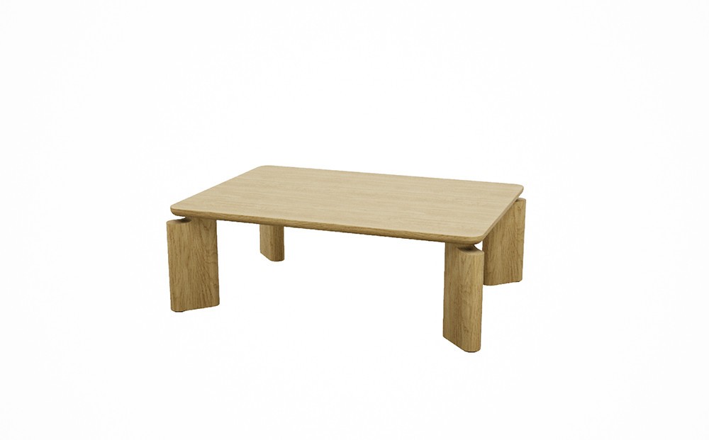 重さと軽さのコンビネーションが際立つリビングテーブル。ボリュームのある幅広の脚部と天板との設置面はアールをつけて立ち上げ、デザインに抜け感をもたらしています。