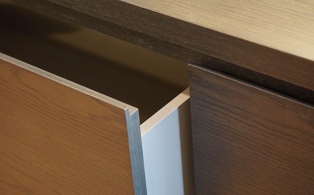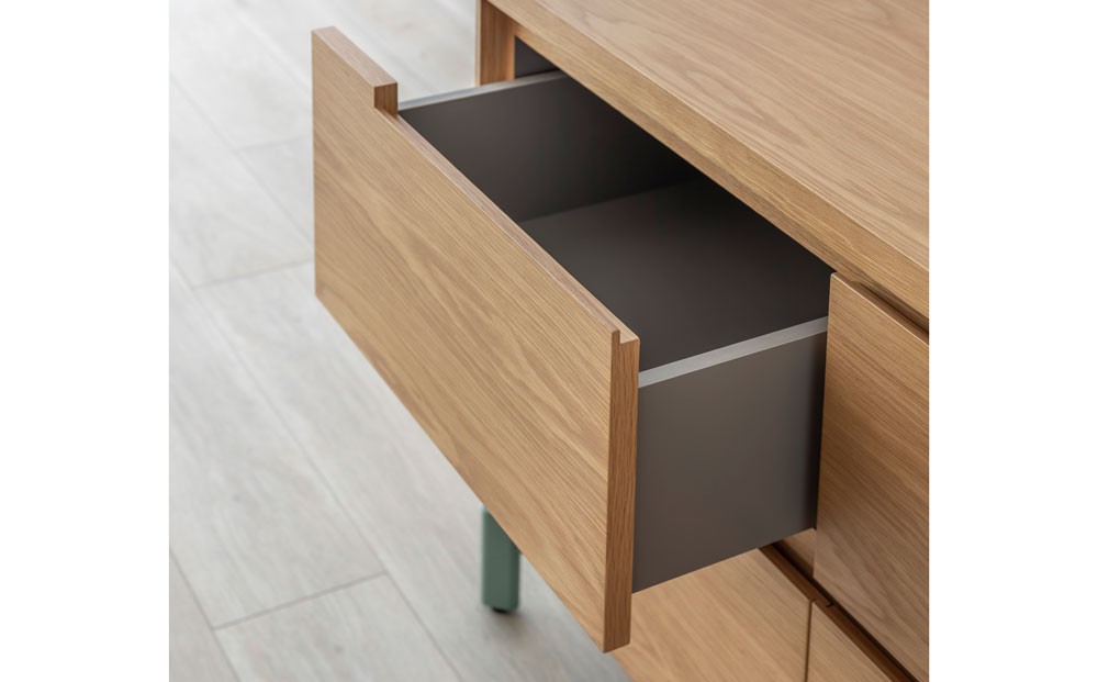 シーンに合わせて好みの仕様を選べるスタンダードキャビネット。本体はオーク材スーパークリア、マロンブラウン、チャコールグレーの3色展開。深さのある引出しはリビングボードとしてはもちろん、ベッドルームやワークスペースまで様々なシーンで活躍します。