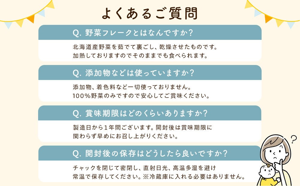 また、添加物・着色料などは一切使用しておらず、北海道産野菜100%ですので、どなたでも安心してお召し上がり頂けます。