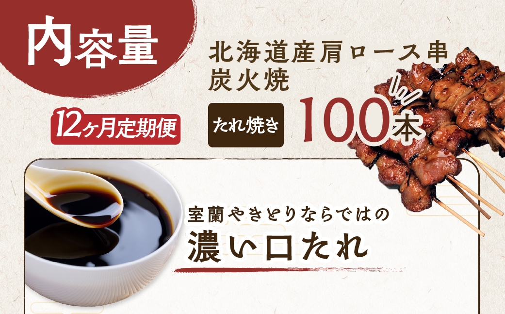 チョイスPayポイントと交換できる品 12ヵ月 定期便 室蘭やきとり たれ焼き 100本 焼き鳥 【 ふるさと納税 人気 おすすめ ランキング 定期便 室蘭 やきとり たれ焼き 100本 焼き鳥 串焼き 鶏肉 豚肉 肩ロース 肉 たれ 串 おつまみ 酒 醤油 セット 大容量 詰合せ 北海道 室蘭市 送料無料 】 MROA003