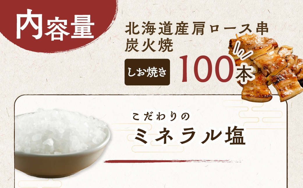 | 容量 | 各月 北海道産肩ロース串 炭火焼 しお焼き×100本 |