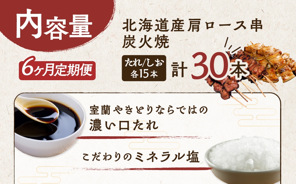 チョイスPayポイントと交換できる品 6ヵ月 定期便 室蘭やきとり たれ焼き15本 しお焼き15本 焼き鳥 【 ふるさと納税 人気 おすすめ ランキング 定期便 室蘭 やきとり たれ焼き 15本 焼き鳥 串焼き 鶏肉 豚肉 肩ロース 肉 たれ 塩 しお 串 おつまみ 酒 醤油 セット 大容量 詰合せ 北海道 室蘭市 送料無料 】 MROA032