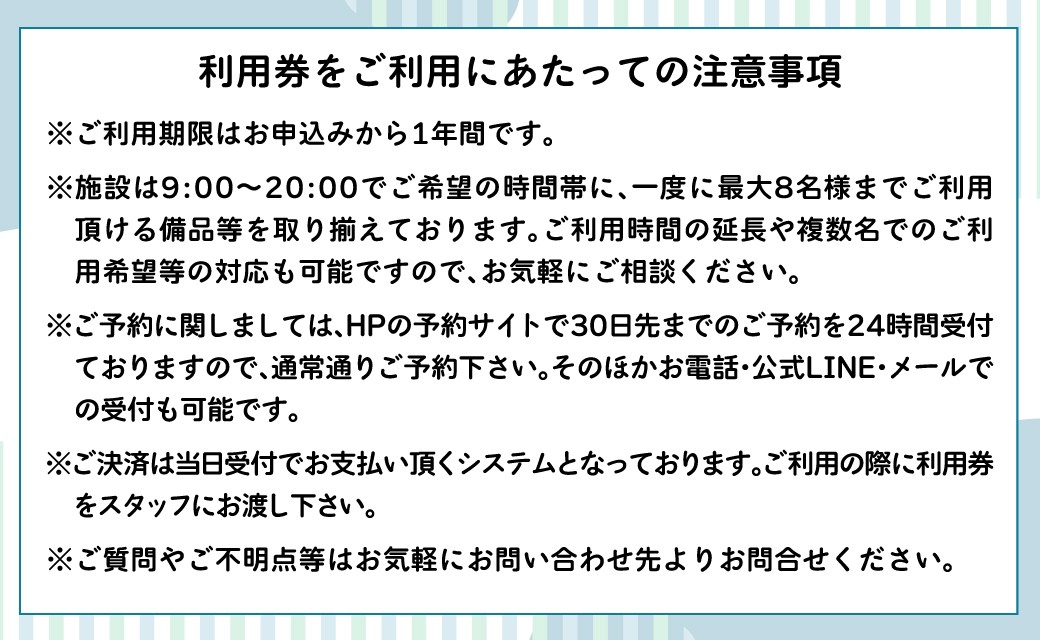 | 容量 | 利用券1枚 【注意事項】 ※お申込みから1年以内のご使用をお願い致します。 ※当施設は9:00-20:00の中でご希望の時間帯にお好きな時間だけ、そして一度に最大8名様までご利用頂ける様備品等取り揃えております。その為、利用時間の延長や複数名でのご利用希望等諸々対応可能ですので、是非お気軽にご相談頂けたらと思います。 ※ご予約に関しましては、HPの予約サイトで30日先までのご予約を24h受付ておりますので、通常通りご予約下さい。ご決済は当日受付でお支払い頂くシステムとなっておりますので、その際に利用券をスタッフにお渡し下さい。また、予約サイトのほかにもお電話・公式LINE・メールでの受付も可能です。ご質問やご不明点等、些細な事でも構いませんので、是非お気軽にお問合せ頂けたらと思います。 ※画像はイメージです。 |