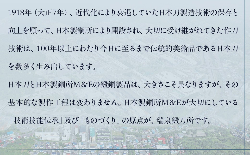 日本刀と日本製鋼所M&Eの鍛鋼製品は、大きさこそ異なりますが、その基本的な製作工程は変わりません。日本製鋼所M&Eが大切にしている「技術技能伝承」及び「ものづくり」の原点が、瑞泉鍛刀所です。