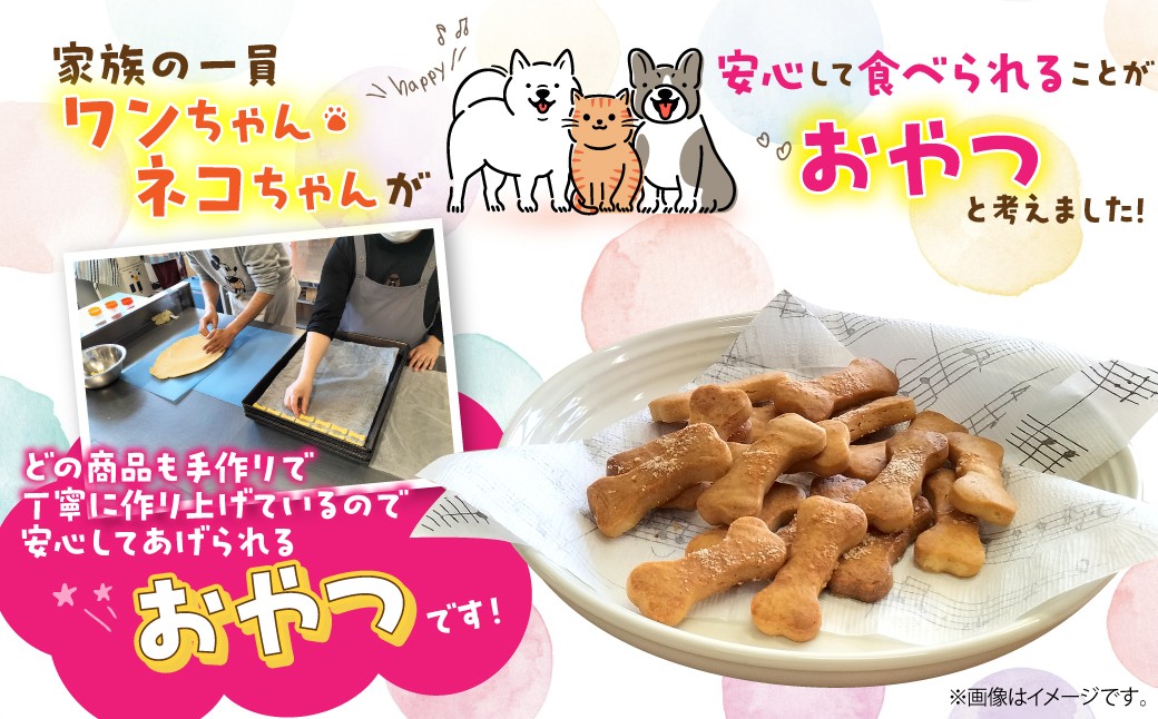 家族の一員のワンちゃんや猫ちゃんが安心して食べられることがおやつと考えました。