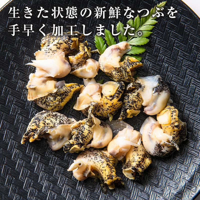 生きた状態の新鮮なつぶを手早く加工しているため、歯ごたえを残しつつ素材をそのままお楽しみいただけます。