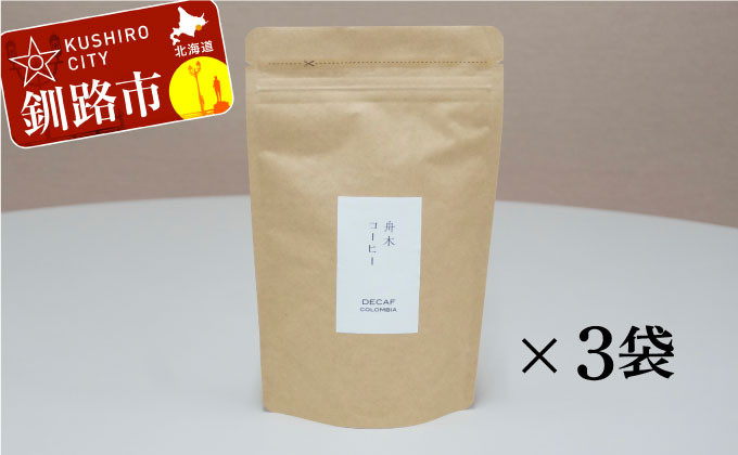 厳選したスペシャルティコーヒーを自家焙煎している「舟木コーヒー」のコーヒー豆セット。カフェインが苦手な方、妊娠中の方、お子様にも飲んでいただけるデカフェ(カフェインレスコーヒー)100g×3袋です。粉の状態でお届けします。