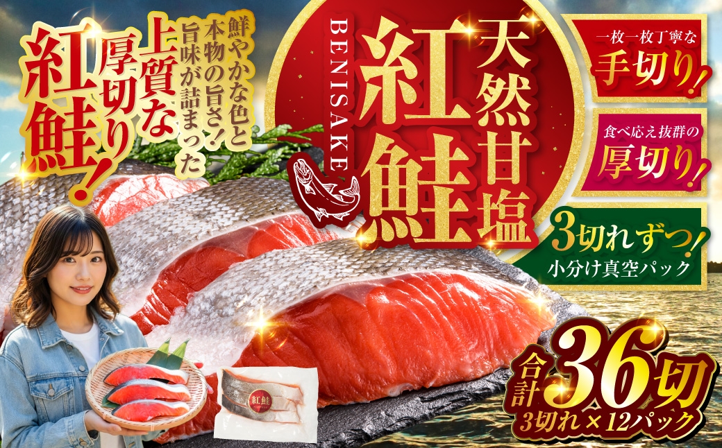 北洋天然沖獲り(早期漁獲)した紅鮭を甘塩仕立てに仕上げました!! 12月発送 天然紅鮭 3切×12パック 36切れ 鮭 焼き魚 おかず お弁当 大容量 サケ 紅鮭 甘塩 天然 魚 魚介 海産物 F4F-2195