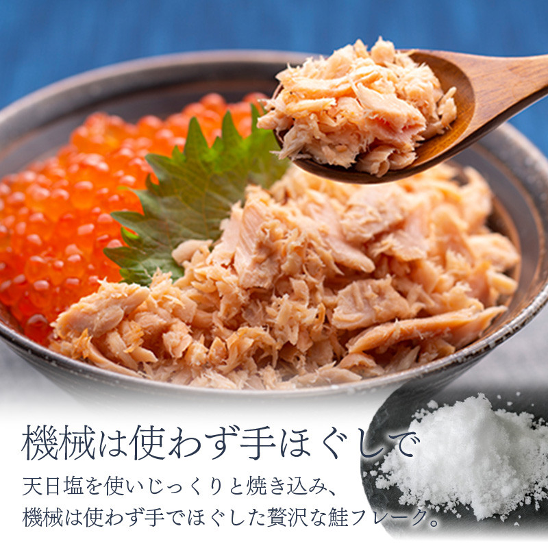 ◇着色料不使用で、天日塩を使いじっくりと焼き込み、機械を使わず手でほぐした贅沢な鮭フレーク、